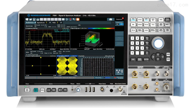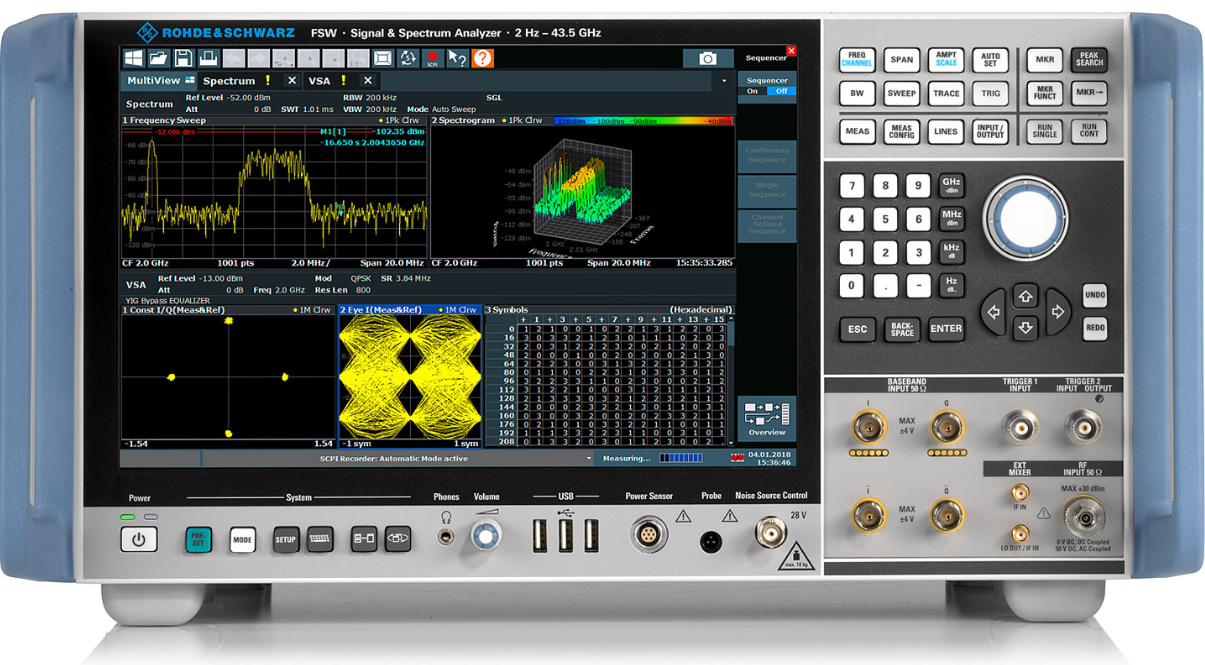 高性能 R&S®FSW 信号与频谱分析仪可帮助工程师完成严苛任务。它具备较高的内部分析带宽,可对宽带组件和通信系统进行特征校准。该仪器具备出色的相位噪声,有助于开发适用于雷达等应用的高性能振荡器。